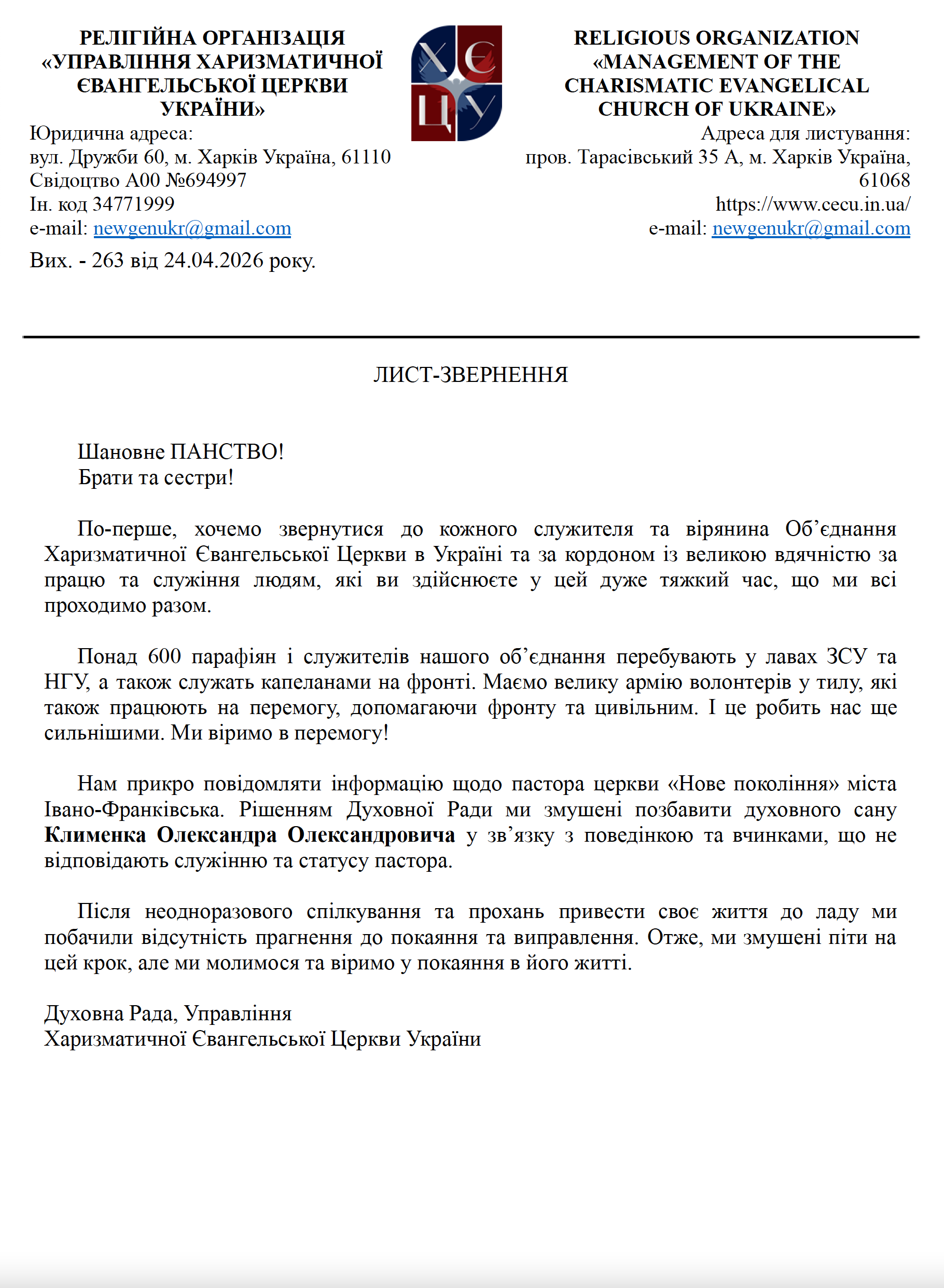 Офіційне звернення Духовної Ради Об’єднання щодо статусу пастора Олександра Клименка